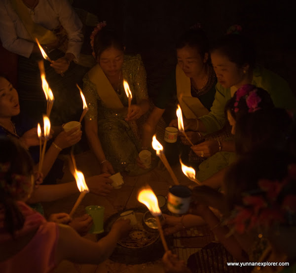 To see the old year out, for three days before their New Year, the Dai of Mangxin, a small township near Menglian, pay their respects to the old year by travelling to three temples in the vicinity. At each temple they celebrate with dance, food, offerings and just a little bit of watersplashing.