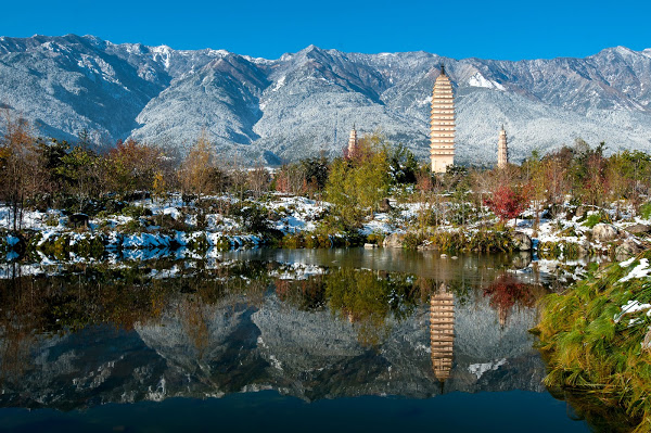 Once a decade snow falls on the Dali plain, dusting not only the Cangshan mountains, but also the old city and its beautiful pagodas in white.