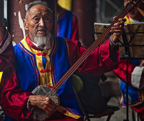 Members of the Dongjing Ancient Music Association perform at the Benzhu Festival in Zhonghe village, on the slopes of Cangshan